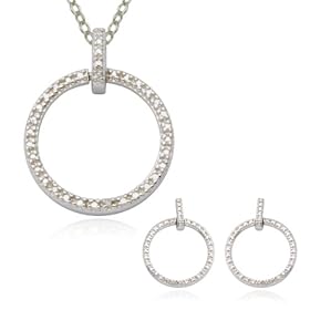 Sterling Silver Rhodium Plated Sterling Silver Genuine Diamond Circle Pendant, 18" and Earring Set: Jewelry