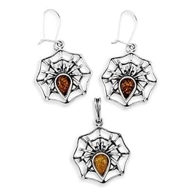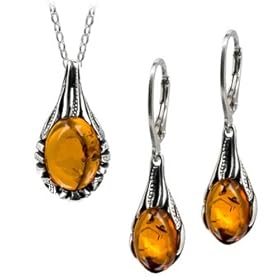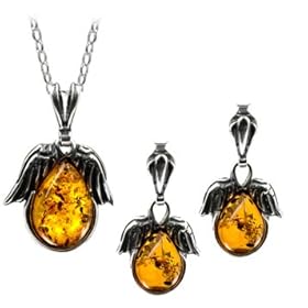 Sterling Silver Baltic Cognac Color Amber Angel Wings Necklace and Earrings Set: Jewelry