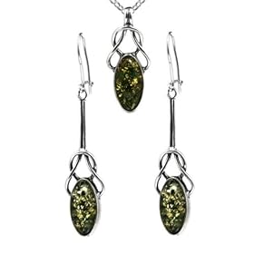 Green Amber and Sterling Silver Celtic Pendant and Earrings Set, 18": Ian and Valeri Co.: Jewelry
