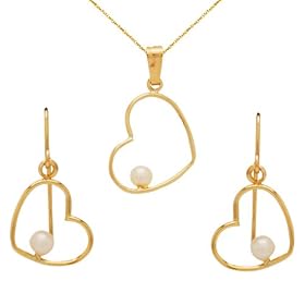 10k Yellow Gold Open Heart Freshwater Cultured Pearl Pendant and Earrings Set: Jewelry