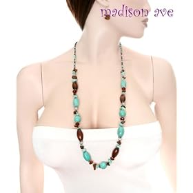 Oval Brown Wooden Beads & Turquoise Fashion Necklace & Earring Set: Jewelry