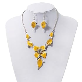 Yellow Enamel Diamante Floral Necklace & Drop Leaf Earrings Set In Rhodium Plated Metal - 36cm Lenght (4cm extender): Jewelry
