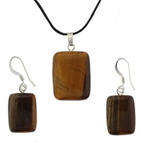 Tiger Eye Rectangle Pendant and Earring Set - Pendant 17mm x 22mm, Earrings 13mm x 18mm - Adjustable Cord Necklace: Jewelry