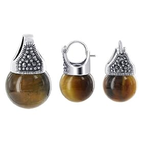 .925 Sterling Silver Round Shape Tiger Eye and Marcasite Accents Snap Back Closure Findings 12mm x 20mm Earring Pendant Jewelry Set: Jewelry