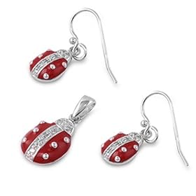 Sterling Silver Ladies Red Ladybug With CZ Cubic Zirconia Earrings & Pendant Set FREE Chain (0.90 Inch): Jewelry