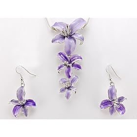 Violet Purple Hawaiian Enamel Silver Tone Tropical Flower Necklace Earring Set: Jewelry