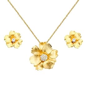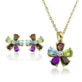 Yellow Gold Plated Sterling Silver Multi-Gemstone Flower Earrings and Pendant Set, 18": Jewelry