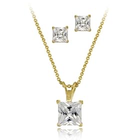18K Gold over Sterling Silver Square Princess Cut CZ Solitaire Pendant & Stud Earrings Set: Jewelry