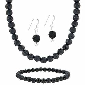 Sterling Silver 6mm Genuine Faceted Onyx Stone Bead Beaded Dangle Hook Earrings Stretch Bracelet Necklace 15-19" Jewelry Set: Jewelry