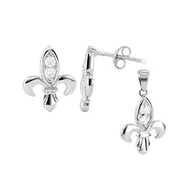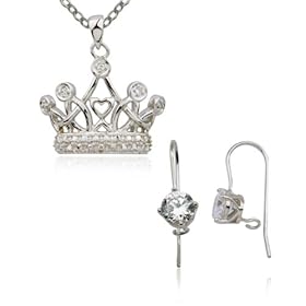 Sterling Silver Rhodium Plated Sterling Silver Cubic Zirconia Crown Pendant, 18" and Earring Set: Jewelry
