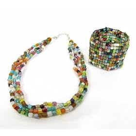 Zad Glass Mosaic Multi-Color Bead Beaded 3-Strand Necklace & Elastic Bracelet Set: Jewelry