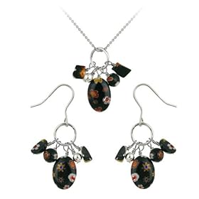 Sterling Silver Black Hand-Blown Glass Cluster French Wire Earrings and Cluster Pendant with Rolo Chain Set, 18": Jewelry