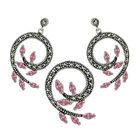 Sterling Silver Marcasite and Amethyst Glass Earrings and Pendant Set, 18": Jewelry