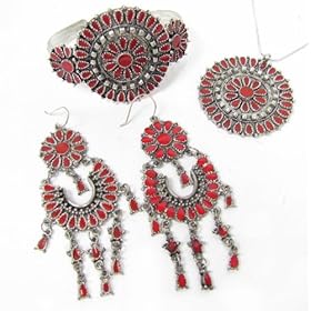 Zad 3 Piece Set Southwestern Necklace Pendant Chandelier Earrings & Cuff Bracelet (Red enamel): Jewelry