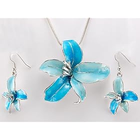 Tropical Hawaiian Fresh Flower Sky Blue Enamel Silver Tone Necklace Earring Set: Jewelry