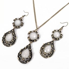Vintage Bronze White Gem Stone Drop Dangle Earring Pendant Chain Necklace Set Valentines Day Gift: Jewelry