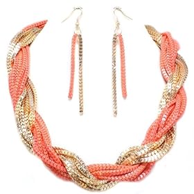 Fancy Chunky Gold Tone and Orange Twisted Chains Statement Necklace and Earrings Set Elegant Trendy Fashion Jewelry: Jewelry
