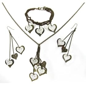 Zad 3 Piece Jewelry Set Antiqued Gold-metal Heart Charm Bracelet Dangle Drop Earring & Pendant Chain Necklace Gift: Jewelry