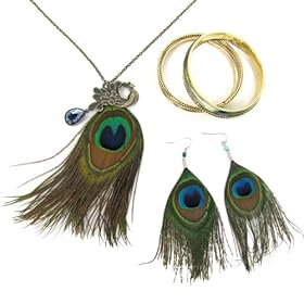Zad Peacock Jewelry 7 Piece Set Feather Dangle Earrings Chain Pendant Necklace & Bangle Bracelets: Jewelry