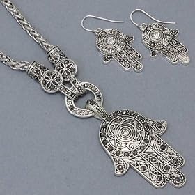 Womens Necklace & Earrings Set, Hamsa (Hands of God) Silver Burnished/ Jet Hematite/ Clear: Jewelry