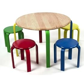 Lipper International 559N Child"s Round Natural Finish Table and 4 Multicolored Stools Set: Home & Kitchen