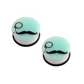 White Acrylic Single Flared Plugs with Glow-In-The-Dark Monacle and Mustache Design and O-Ring - 2G (6mm) - Sold as a Pair: Jewelry