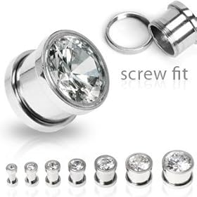 316L Surgical Steel Screw Fit Tunnels with Clear Press Fit Gem - 0G (8mm) - Sold as a Pair: Jewelry