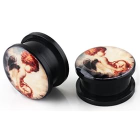 Pair of Victorian-Era Cherub Angel Design Black Acrylic Ear Plugs - 1/2": Jewelry