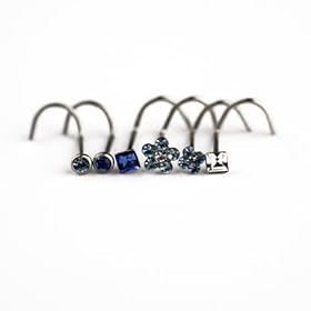 7 Pack-22G Surgical Steel Nose Screws: 6 Crystal-Blues, Clear- Flowers-1 Retainer-Hinged Gift Box: Jewelry