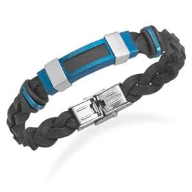Mens Black Leather Braided Bracelet 316L Surgical Steel Blue: Jewelry