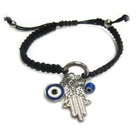 Black Cord Bracelet with Circle Hoop and Hamsa/Hand of Fatima Charms - Evil Eye: Jewelry