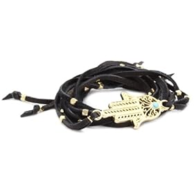 Ettika Black Leather Wrap Bracelet with Gold Colored Hamsa Charm: Jewelry