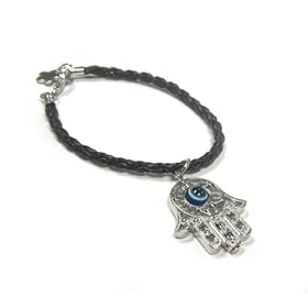 Black Leather Cord Bracelet with Hamsa/Hand of Fatima and Evil Eye Charm - Good Luck Bracelet: Jewelry
