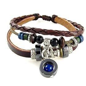 Blue Bead Three Strand Brown Leather Zen Bracelet, Adjustable for Men and Women: Jewelry