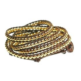 Wrap Bracelet "Harmony" Golden Beads on Brown Leather. Extra Long Bracelet Wraps 5 to 6 Times: Jewelry