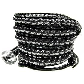 Wrap Bracelet "Noir" Hematite and Black Leather, Wraps 5 to 6 Times: Jewelry