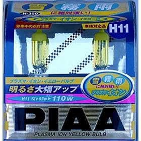PIAA 13511 H11 12-Volt Plasma Ion Crystal Yellow 55=100-Watt Bulb - Twin Pack: Automotive. Less reflective than white, this light reduces the amount of glare in extreme fog and improves visibility in inclement weather. The PIAA H11 Style Plasma 55=110 watt bulb provides 110 watts of light for 55 watts of power, and produces an amber/yellow light using patented ion crystal technology.