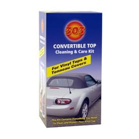 303 Vinyl Convertible Top Kit: Automotive. There is no better product on the market at protecting vinyl from the sun, water, soil and stains. 303 Vinyl Convertible Top Kit includes:Keep your convertible in tip top shape with 303 Vinyl Convertible Top Kit!The 303 Convertible Top Cleaner and the 303 Aerospace Protectant are everything you need to keep your convertible top looking like new.Youve no doubt seen what can happen to a neglected vinyl top over time: drying, cracking and fading. Even if your vehicle lasts forever, your vinyl convertible top might not if you dont take care of it. Thats why we offer both the 303 Convertible Top Cleaner and the 303 Aerospace Protectant together in the 303 Vinyl Convertible Top Kit. In just two steps, you can remove oil, grease and dirt from your top and provide the best protection available for vinyl.303 Vinyl Convertible Top Kit includes:303 Convertible Top Cleaner utilizes a unique colloidal inch action to lift and suspend oil, grease and dirt so that it easily wipes away. This same colloidal action was found to break up oil slicks on the ocean. It contains no soaps or detergents that can dry or leave a residue. Also, the environmentally safe formula contains no toxic organics, phosphates, nitrates or caustics to irritate your skin or run off into your yard. All 303 cleaners are safe, non-toxic and 99% biodegradable. While 303 Convertible Top Cleaner is safe to use, you can be sure its effective because it bares the 303 name. 303 is unparalleled in the auto care industry for cleaning and preserving vinyl. You can also use 303 Convertible Top Cleaner on walls, kitchen appliances, carpets, motors, light fixtures, countertops, and bathroom fixtures anything water-safe.Follow the cleaner with 303 Aerospace Protectant to prolong the life of your vinyl top. 303 Aerospace Protectants UV screening technology is like SPF 40 sunscreen all over your vinyl top.