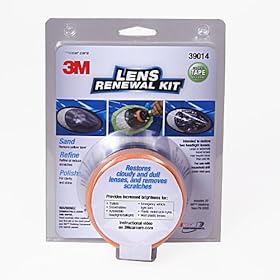 3M 39014 Lens Renewal Kit: Automotive. For use with a drill. In the past, replacing scratched, clouded or yellowed plastic headlight covers was an expensive necessity in order to preserve safety. But now with the 3M Lens Renewal Kit, car, motorcycle, RV and trailer owners can shine and restore plastic lenses -- including headlights, tail lights, fog and directional lights -- to like-new condition for a fraction of the cost of visiting a garage. Combined with a user-supplied household drill (1200-1600 rpm), clean cloth and spray bottle, this kit includes everything needed for you to restore two headlight lenses, including 25' of 3M Premium Masking Tape used to protect auto body panels during the process. Renew clouded plastic headlights to crystal clarity. View larger. Plastic lens renewal in 4 easy steps. View larger. Protect body panels with included masking tape, then sand out scratches and dullness. View larger. Refine and reduce remaining scratches, then polish. View larger. With the 3M Lens Renewal Kit your lenses will look as good as new. Hazy lenses are a thing of the past with the 3M Lens Renewal Kit. Designed to provide increased brightness to plastic lenses, this kit comes with everything you need to do the job - just add a drill! It will remove the hazy, yellow layer from lenses on trailers, snowmobiles, headlights/taillights, emergency vehicle light bars, plastic motorcycle lights and more. Increase your nighttime visibility and the appearance of your vehicle using the 3M Lens Renewal Kit. This inexpensive kit saves may save hundreds of dollars as with purchasing brand new lenses from the dealer and restores crucial night time visibility by allowing you to restore your own lenses. Kit contains masking tape, sanding discs, and polishing pad with compound. This kit is similar to the 3M Headlight Restoration kit.