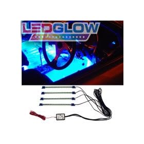 4pc. Blue LED Interior Underdash Lighting Kit: Automotive. The included control box features many different patterns such as strobe, fading, and chase effects. LEDGLOWs Blue Interior Kit is jam-packed with an assortment of features and four super bright LED tubes to illuminate your car's interior. Each kit includes a total of four 9inch tubes with 18 ultra bright LEDs per tube giving you a total of 72 wide angle LEDs and you can mount it to your foot well, under your seats, or even your dash. Each tube also includes 4 ft 8 inches of wire allowing maximum mounting capabilities. New to this kit is a sound activation feature with a sensitivity controller giving you even further customization options.