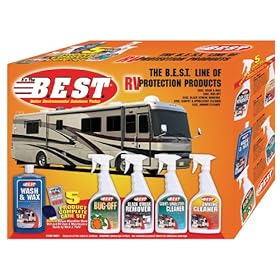 B.E.S.T. 99001 RV Cleaning Kit - 5 Piece: Automotive. Helps protect against damaging sun rays, weathering and salt. All the B.E.S.T. products you need to get you started detailing your RV, boat, or vehicle. Environmental Products of America Midwest got the 5 B.E.S.T. products in one box: Wash and Wax, clean, shine and protect your vehicle in the same time it used to take for washing alone. One step wash and wax shines without buffing. After your first try you won't want to use any other wash and wax. Carpet and Upholstery Cleaner, removes even the most stubborn stains. Our Carpet and Upholstery cleaner leaves carpet, upholstery and cloth furniture clean, bright and fresh with no sticky film to attract more dirt. Bug-Off, There is finally a solution to removing dead bugs from your windshield, front grill or any part of your vehicle. We have all had the experience of bugs all over your vehicle or on your windshield and they just wont come off, but the Environmental Products of America Bug-off Remover is not only easy to use - just spray on and wipe or rinse off it also works. Black Streak Remover, Easily removes black streaks, tar and road grime build up on any RV with minimal rubbing. Also great for tires, white walls, wheels and gutters. Environmental Products of America's Black Streak Remover is safe for use on fiberglass, metal and painted surfaces when used as directed. BEST products contain no acids or caustics, won't harm or fade decals. Keeps your awning looking new. Use to remove mold, mildew, dirt and grime. Works great on acrylic, vinyl, synthetic and natural fibers and will work on convertible tops and Jeep tops as well.