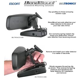 BlendMount Your Beltronics / Escort Radar Detector. High Quality Custom Mount: Automotive. Once you receive and install your BlendMount, there are other adjustments that allow the perfect placement of your RD, such as (1) Stem Slide, (2) Hinge Swing, and (3) Vertical Slot (see pics). When we designed the BlendMount for the Beltronics or Escort (Passport) Radar Detector (RD), quality and adjustability were our main objectives. We wanted to utilize the dead space between the back of the mirror and the windshield. With the multiple adjustments we designed, the perfect RD placement can be achieved. Even before receiving your BlendMount, first Adjustment is to reposition your Mirror Stem so it is perpendicular to your Windshield by using the Windshield Pivot at the end of your Cylindrical Stem (see pics). Next adjustment is to also reposition the Stem as High as possible using the same Windshield Pivot. Both these adjustments ensure that your RD will point straight out the Windshield, and minimize any View Obstruction. Then simply readjust the Mirror using the Mirror Pivot only, taking care not to disturb the newly acquired Stem Position. All these adjustments are clearly described in our Installation Instructions and literally allow for the Perfect Placement of your RD.