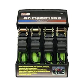 Grip 4 Piece 1-Inch x 15-Foot Ratchet Tie Down Set: Sports & Outdoors. Set weighs 8 lbs.; Lash down your cargo! Order this amazing 4-Pk. Never let go! 4 Grip - on 15' Ratchet Straps, PRICED LESS! Keep your pride and joy from taking a dive around the next corner! Properly secure ATV's, lawn equipment, motorcycles and more to your truck bed or trailer. This handy Set of 4 tough Grip-on Ratchet Straps is ready to provide iron-clad security on your next trip out to the wild. You can never be too careful! 1w. high-strength low-elongation polyester webbing for optimum performance; Edges are reinforced with textured nylon fibers for maximum cut and abrasion resistance; Extra-wide grip for easier, faster operation; Design won't loosen from road vibration; Rubber-coated S-type hooks won't rust, and they also keep your property free from scratches; 1500 lbs. maximum workload. Each measures 15'l. today! 4-Pk.