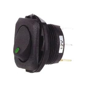 Hella On/Off Flush Mount Rocker Green LED Switch: Automotive. load 12V 20A. Round mounting hole. Illuminated in On inch position. Max. Three 3/16 inch Blade Terminals.