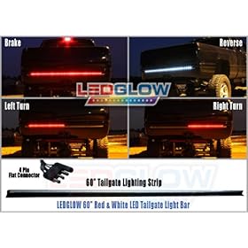LEDGLOW 60 inch Red & White LED Tailgate Light Bar: Automotive. 3M tape and screws are provided for a fast and trouble-free installation. LEDGLOWs 60 inch Red and White LED Tailgate Light Bar is a slim yet durable LED light bar designed to bring your truck added safety and visibility with running, brake, reverse, hazard and turn signal light functions to your vehicles tailgate. Each water resistant light bar includes 56 red LEDs to provide your truck with the best illumination possible to clearly and efficiently signal other vehicles on the road. Also includes 28 white reverse light LEDs for even further functionality. Plug and play connectivity with the included standard flat 4 pin trailer connection harness to provide highly visible brake, running, hazard and turn signal light functions. Connect the additional white wire to your vehicles reverse light power wire for an added reverse light ability. For trucks that do not have a standard flat 4 pin connection, easily splice the wires for a secure hard-wired connection. With its 60 inches in length, it will easily fit most full size trucks however a precise measurement of your tailgate is recommended before purchasing.