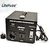 LiteFuze LT-3000 3000 Watt Heavy Duty Voltage Converter Transformer - Step Up/Down 110/120/220/240V - Fully Grounded Cord (Free Euro Plug) - Patented Universal Output Socket - Circuit Breaker Protection: Electronics. Four outlets for output in the front - 1 socket - Universal outlet (220v) - 1 socket - German Shucko outlet (220v) - 2 sockets - USA Grounded (110v) Fuse protected - Fuse will cut off the current if the transformer is overloaded to protect the transformer and your appliance NOTE: We recommend to use a Voltage Converter / Transformer that's max watts is at least 50% higher than your appliance. 3000 Watt Maximum Capacity Heavy-Duty Voltage Converter/Transformer Heavy duty for continuous use On/Off Power Switch LED Indicator for Power Source Single phase Dual Voltage Step Up or Step Down functionality Input: 110V/120V or 220V/230V/240V (Single Phase) Output 110V/120V or 220V/230V/240V (Single Phase) Input Selection in the rear of the converter Dimensions: 11x9x8 inch * Weight: 36 lbs.