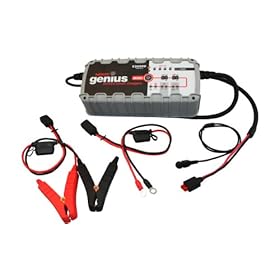 NOCO Genius G26000 12V/24V 26000mA Fully Automatic Battery Charger and Maintainer (Grey): Automotive. High-frequency, high-efficiency for a lightweight, compact charger. This is a smart, 15 Step, fully automatic switch-mode battery charger and maintainer. It restores batteries to their original capacity, recovers slightly sulfated batteries, charges batteries in cold climates, rescues drained batteries, and provides maintenance charging to increase battery life. A powerful battery charger with specialized charging modes for recovering severely drained batteries, that will not accept a normal charge and the ability to perform an equalization charge. It comes equipped with a remote temperature probe for optimized charging performance. Suitable for most 12 volt and 24 volt battery capacities from 25-500Ah, such as motorcycles, ATVs, UTVs, snowmobiles, RVs, boats and trucks. NOCO's battery chargers are fortified with several unique safety features to protect you, your battery and the battery charger. The VosFX processor is a revolutionary smart processor utilizing sophisticated levels of intelligence to alter the charge process based on organic feedback from the battery. The processor quickly and efficiently makes decisions on how to charge the battery without risking user safety or damage to the battery. Rugged enclosure is made from a rugged polymer for high-impact resistance for some of the harshest and most demanding working environments. Features a fully insulated over-mold casing with strain relief ends to alleviate unwanted tension on cable leads. Each battery connection accessory features an over-molded inline fuse to increase user safety by protecting the battery charger from potentially dangerous short circuits. An interchangeable connector allows accessories to be properly mated and fastened with a snap-lock latch. Returns to last selected mode when restarted. The box includes a charger, battery clamp connectors, eyelet terminal connectors, owner's manual and user guide, product registration card.