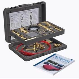 OTC 6550PRO Professional Master Fuel Injection Service Kit: Automotive. All seals and o-rings in the 6550PRO from OTC are made with highly durable Viton material to prevent swelling or cracking when exposed to gasoline, alcohol blends and even the most aggressive injector cleaning chemicals. This Professional Fuel Injection Master Fitting Kit from OTC puts a full coverage fuel system service kit in your toolbox and greater service opportunities in your shop. This kit from OTC comes with an analog fuel pressure gauge preferred by professional service technicians giving precise pressure readings as well as a view of pressure sweeps during the testing analysis. The pressure testing manifold is designed with a bypass valve letting the technician perform basic fuel flow assessments. The 6550PRO has more adapters than any other kit we’ve found giving the best coverage of any kit on the market. Domestic, Asian and European we’ve got ‘em. Each adapter works with schrader valve fittings to ensure user safety by preventing fuel spray when connecting or disconnecting the pressure gauge (included) the fuel line, or an accessory like a cleaning canister. It comes with an application manual showing technical references for make/model/year, engine for vehicles produced between 1997 and 2008 inclusive.