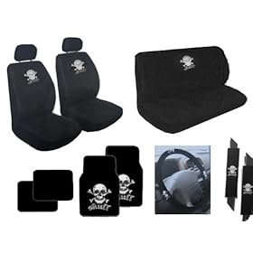13 Piece Auto Interior Gift Set - 2 White Skull and Cross Bone Front Low Back Bucket Seat Covers, 2 White Skull and Cross Bone Head Rest Covers, 1 White Skull and Cross Bone bench seat Cover, 1 White Skull and Cross Bone Steering Wheel Cover, 2 White Skull and Cross Bone Shoulder Harness Pressure Relief Cover, 2 White Skull and Cross Bone Front Floor Mats, and 2 Plain Black Rear Floor Mats: Automotive - TitanicImports.com