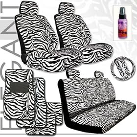 Brand New Premium Grade Zebra Print Low Back Front and Rear Seat Covers Set with Steering Wheel Cover, Seat Belt Covers, a Set of 4 Floor Mats and Purple Slice Total 16 Pieces: Automotive. This set also comes with a 2 oz travel size of the famous Water free Car Detailing inch Purple Slice details your car with just 1 simple step, spray on, wait a few second and wipe it off with micro fiber cloth. This is a premium grade quality velour seat covers set in Zebra print made and import by CEL International Group Inc.. It comes with 2 low back front seat covers with separate head rest cover, rear bench covers with separate head rest covers, steering wheel cover and shoulder pads. These seat covers will fit any cars, and trucks with regular inch size bucket seats. 2 front and 2 back pieces carpet Zebra print mat with nibbed tip backing. The front piece size is 27 inch X 17.25, rear size: 17.5 inch X 13.25 inch The steering wheel covers will fit with steering wheels with 14.5 inch to 15.5 inch in diameter. quality. NOTE: * WILL NOT FIT SEATS WITH ANY OF THE FOLLOWING: 1. INTEGRATED SEAT BELT.2. OVERSIZE SEAT (captain seat). You'll notice in no time the shin and silky feeling Purple Slice provide.